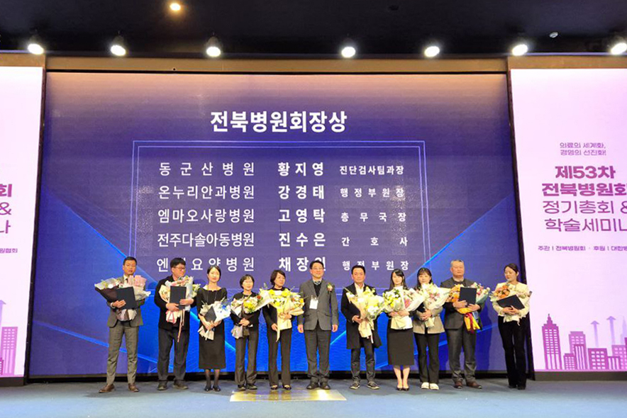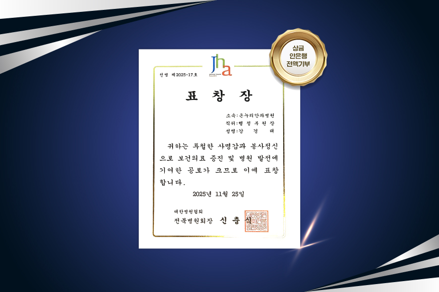 제53회 전북병원회 회장상 수상! 안은행 기부로 나눔의 가치 실현 지난 2025년 11월 25일 전북병원회 주관으로 개최된 제 53회 전북병원회 정기총회 및 학술세미나가 있었습니다. ![]() 매년 지역 의료발전 전략 공유와 회원 병원 간 협력 강화를 위한 자리로, 임상 및 경영 분야의 전문가를 초빙하여 병원들의 의료 서비스 역량 강화에 기여해오고 있습니다. ![]() 이날 정기총회에서는 지역 의료 발전에 헌신적으로 공헌한 기관 및 임직원에 대한 시상이 있었습니다. 온누리안과병원 강경태 행정부원장은 지역 보건 및 의료 발전에 이바지한 탁월한 공로를 인정받아 전북병원회 회장상을 수여받았습니다. 특히, 이번 수상의 의미가 뜻깊은 것은 수상금 전액을 (사)온누리안은행에 기부한 것입니다. ![]() 눈 건강 악화로 어둠 속에 계신 많은 분들이 세상의 빛을 되찾아 삶의 질을 높이는 것을 돕고자 하는 환원의 가치 실현의 일환입니다. 본원은 개인 안과 중 이례적으로 안은행을 운영하며 고난도 각막이식 수술을 진행하고 있습니다. ![]() 안구기증을 통해야만 가능하며 타인을 위한 최후의 배려가 실현되고 숭고한 과정을 필요로 합니다. 2025년 지금까지 본원이식 461안 타의료기관으로 114안 이관을 기록했습니다. 각막이식이 필요한 환우분들을 위해 지금처럼 최선을 다할 예정이며 협력과 연대, 학술 활동을 통해 안과학 발전에 기여하고, 환자 중심의 의료서비스와 질 향상을 위해 끊임없이 노력하며 지역 대표 의료기관으로서 역할을 다하겠습니다. |