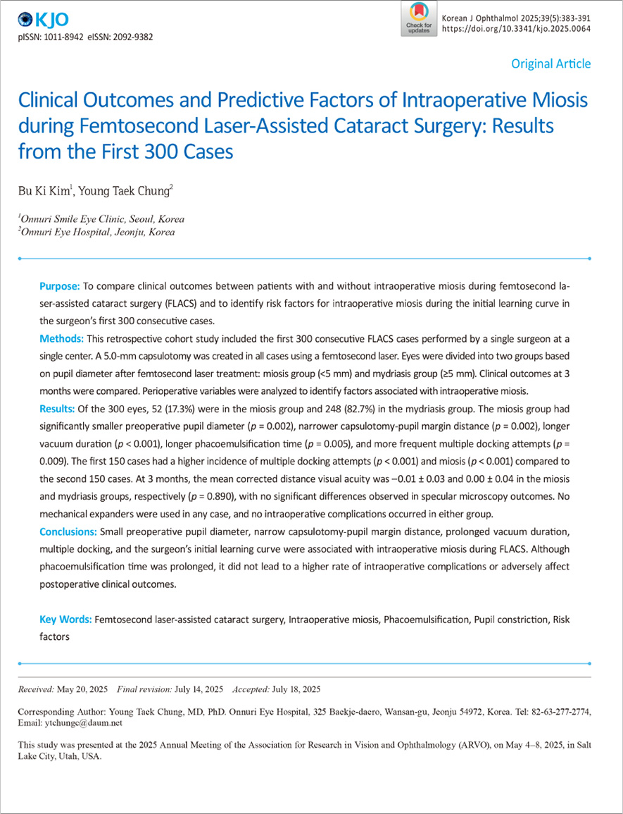 정영택 병원장은 300례 이상의 임상 데이터를 활용하여 축동 발생과 관련된 위험 요인 및 예후에 미치는 다양한 변수를 통계적으로 면밀히 분석하였습니다.